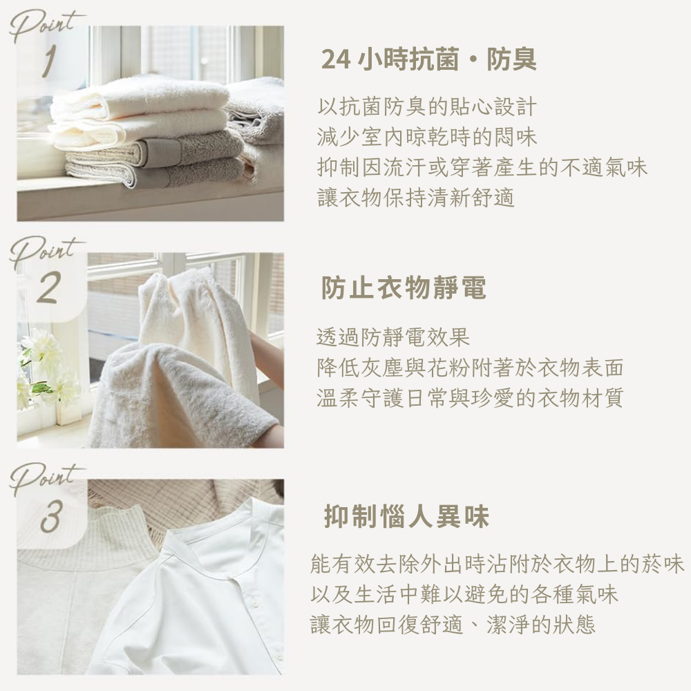 ② 防止衣物靜電透過防靜電效果, 降低灰塵與花粉附著於衣物表面, 溫柔守護日常與珍愛衣物的質感。