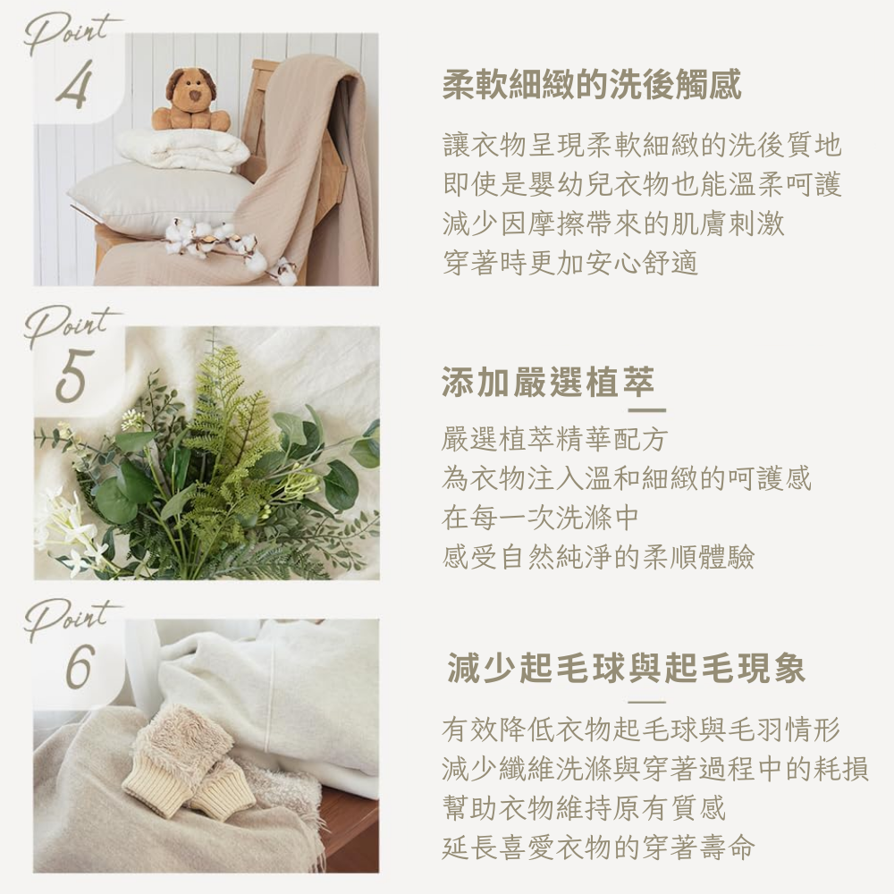 ④ 柔軟細緻的洗後觸感讓衣物呈現柔軟細緻的洗後質地, 即使是嬰幼兒衣物,也能溫柔呵護肌膚, 減少因摩擦帶來的不適刺激,穿著更加安心。