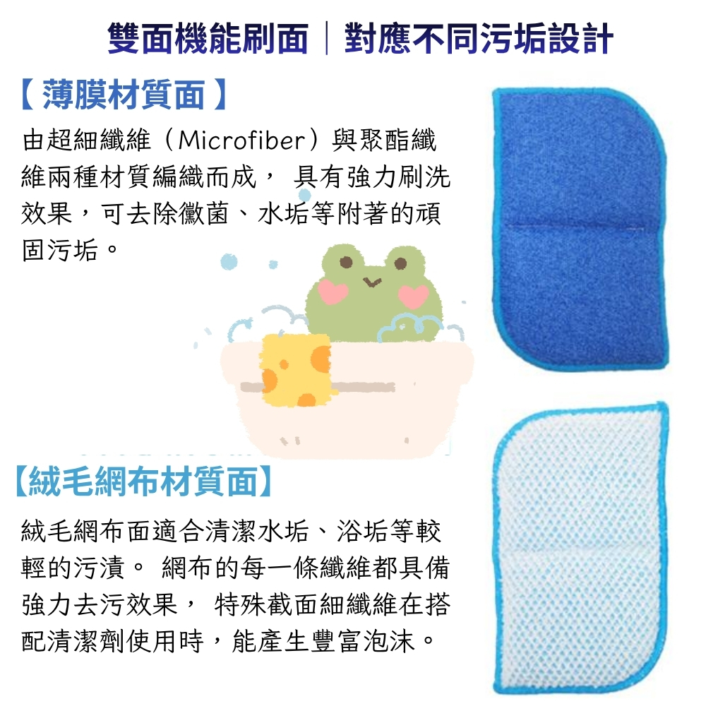• 絨毛網布面(針對皂垢):柔軟織紋能產生細緻綿密的泡沫,快速帶走浴缸邊緣殘留的沐浴乳與皮脂皂垢。
