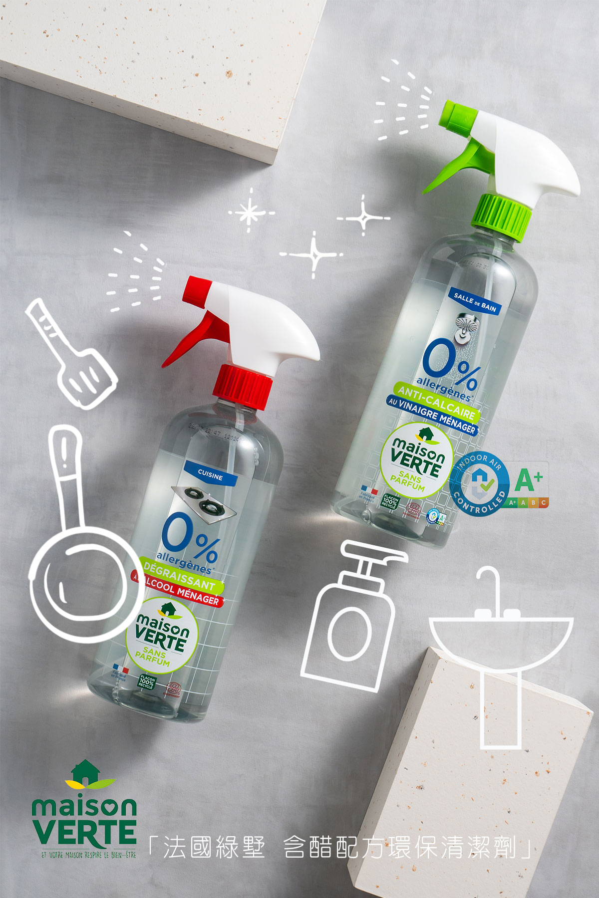 來自法國幸福綠色品牌- Maison Verte(綠墅)和你的家一起充滿幸福 是綠墅品牌的精神,旗下有許多添加精油的家用清潔劑特別為您推出輕省、簡單、高效的家用清潔噴霧,讓您可以輕鬆維持居家清潔,搭配輕省不費力的噴霧設計還能提升隨手清潔廚房和浴室的樂趣喔~兼具高效潔淨與友善環境的家用清潔劑將能更加友善您所居住的家,置身其中也能充滿著幸福。